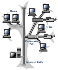 Topologi Jaringan Pohon (Tree) Topologi jaringan ini disebut juga sebagai topologi jaringan bertingkat. Topologi ini biasanya digunakan untuk interkoneksi antar sentral denganhirarki yang berbeda. Untuk hirarki yang lebih rendah digambarkan pada lokasi yang rendah dan semakin keatas mempunyai hirarki semakin tinggi. Topologi jaringan jenis ini cocok digunakan pada sistem jaringan komputer .